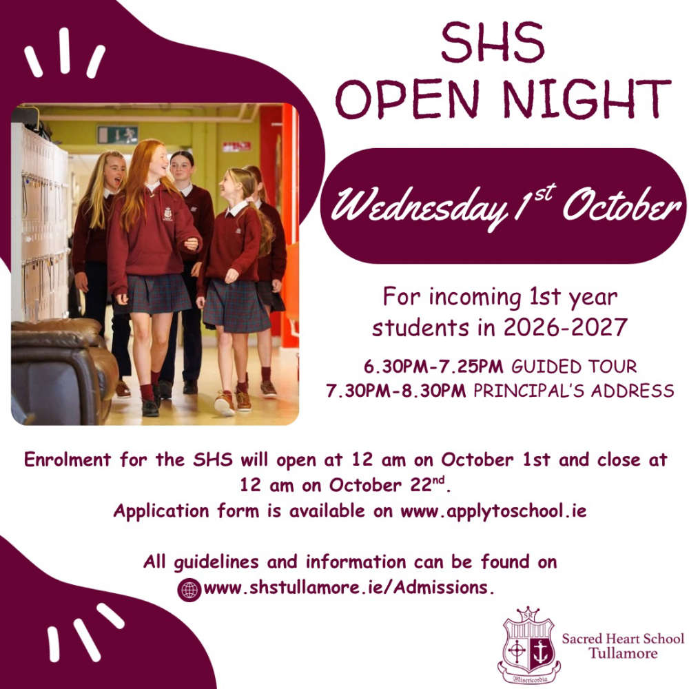 Enrolment for the Sacred Heart School, Tullamore will open on 1st October and close on October 22nd. Application form is available on: www. apply to school.ie A fantastic opportunity to explore the school, meet staff and students, and discover all the school has to offer. We look forward to welcoming future students and families to the school community