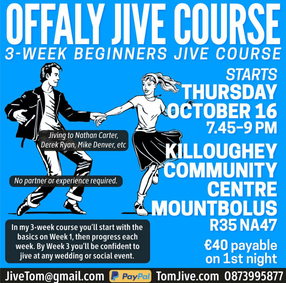 Learn to Jive with Tom: 3 week beginners course starting Thursday 16th October in Killoughey Community Ctr, Mountbolus. €40 payable on 1st night. 7.45pm – 9pm. No partner or experience required. By week 3 you will be confident to Jive at any social event. See Tom Jive on Facebook for more.