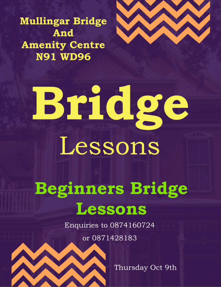 Bridge lessons for Beginners commence on Thursday October 9th (10 weeks duration) in Mullingar Bridge and Amenity Centre N91 WD96. To enquire about lessons in your area, please visit bridgewebs.com or CBAI.ie Call 087 1428183 for details.