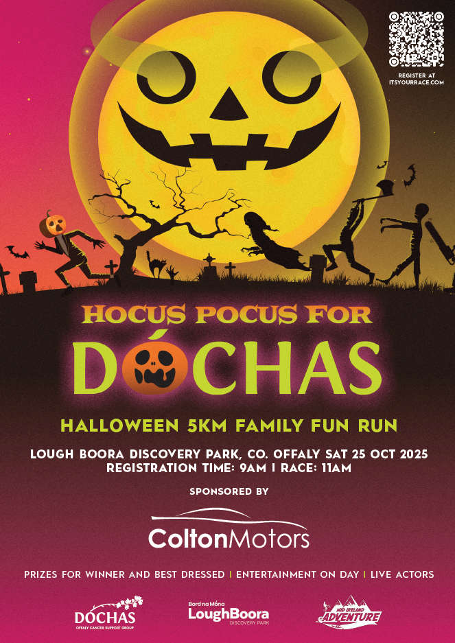 Hocus Pocus for Dóchas! Hallowe’en Family 5k Fun Run takes place on Saturday 25th October 11am at Lough Boora Discovery Park. Register on: Its Your Race – Hocus Pocus for Dóchas! Offaly. Prizes for winner & best dressed. Entertainment for all the family. See Dóchas! Offaly Cancer Support on Facebook for more.