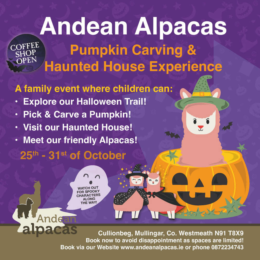 Andean Alpacas Pumpkin Carving and Haunted House Experience is on from 25th – 31st October at Cullionbeg, Mullingar. Meet the Alpacas! Visit the Haunted House! Explore the Halloween trail & pick and carve a Pumpkin! Then relax in the Coffee Shop.. Book today. Limited places available. See Andean Alpacas .ie or call 087 223 4743
