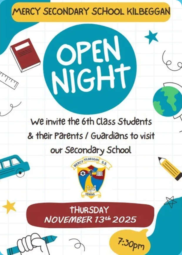 MERCY KILBEGGAN OPEN EVENINGMercy Secondary School Kilbeggan would like to invite 6th class students and their families to our Open Night in our new state of the art campus at 7.30pm on Thursday, November 13th. Prospective students will have the opportunity to tour the school, meet staff and sample all that our amazing school has to offer. We look forward to welcoming everyone on the night!