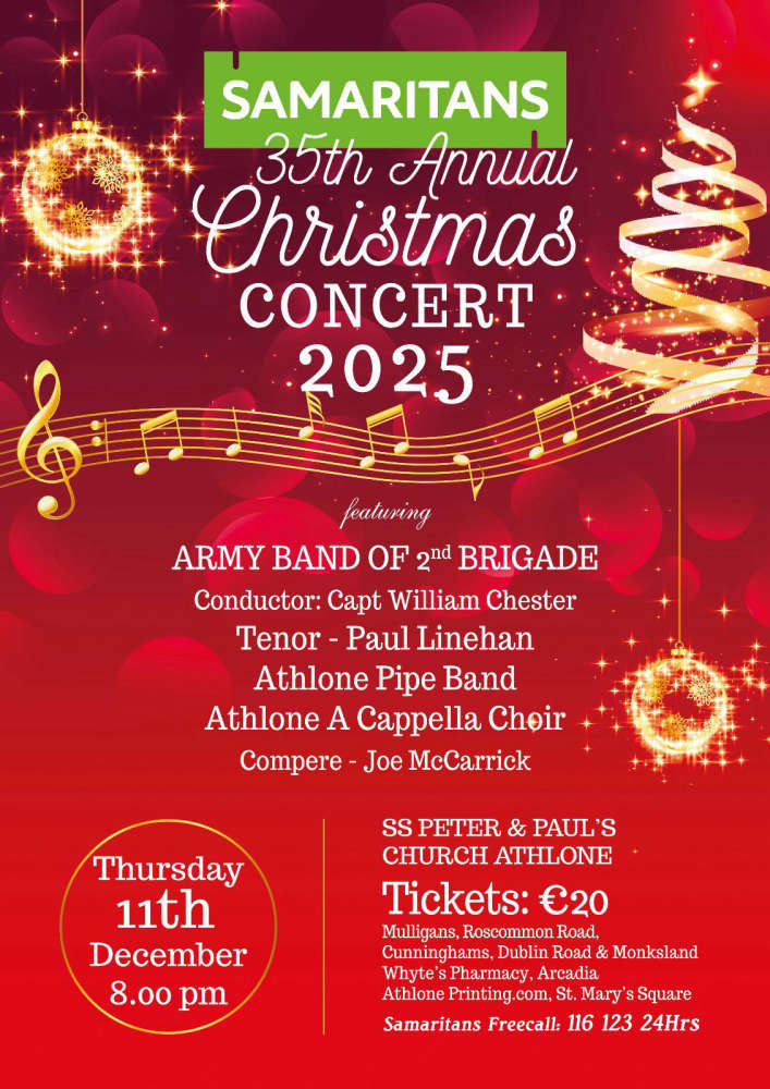 SAMARITANS CHRISTMAS CONCERTSamaritans 35th Annual Christmas Concert is on Thursday 11th December at 8pm. In Sts Peter & Paul’s Church, Athlone. Tickets €20 from Mulligans, Roscommon Rd, Cunninghams Pharmacy & Athlone printing.