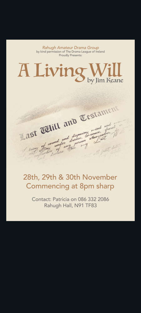 RAHUGH DRAMA GROUPRahugh Drama Group presents ‘A Living Will’ by Jim Keane. On 28th, 29th & 30th November @8pm in Rahugh Hall. Filled with delightful dark comedy, domestic drama and shocking twists. Call Patricia 086 332 2086 for tickets.