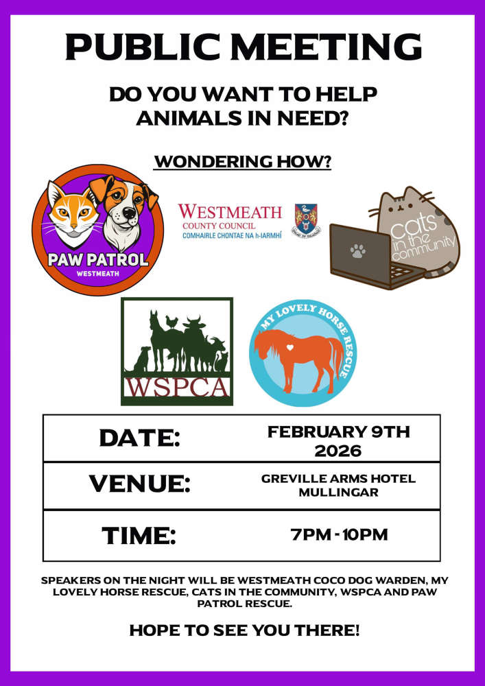 ANIMAL WELFARE MEETINGDo you want to help Animals in need, but don’t know how? A Public Meeting will be held in the Greville Arms, Mullingar on Monday 9th Feb from 7 – 10pm for new Volunteers. Speakers include My Lovely Horse, Cats In The Community, Paw Patrol Westmeath, WSPCA and Mullingar Dog Pound. All help is vital, to enable these organisations to keep open.