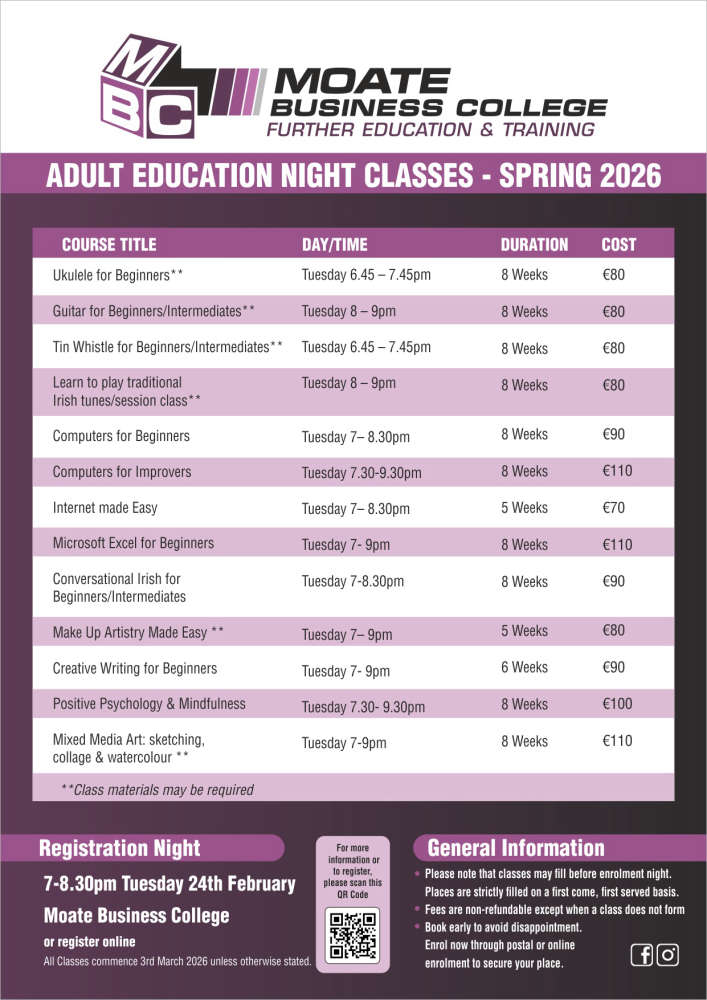 MOATE BUSINESS COLLEGE SPRING NIGHT COURSESSpring 2026 Night Classes start soon in Moate Business College. Register on the adult-ed page of our website or on February 24th from 7-8.30 in Moate Business College. Courses include: Make Up Artistry Made Easy, Guitar & Ukulele lessons, French for Beginners as well as Creative Writing, Computers for Beginners and Conversational Irish. See the full list and Enrol today @ Moate Business College.com