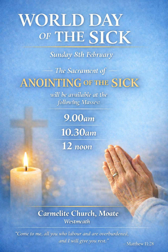 CARMLITE CHURCH MOATE SERVICESOn Sunday 8th February, The Carmelite Community in Moate, Co. Westmeath will mark World Day of the Sick by having the Sacrament of the Anointing of the Sick at all our masses i.e. 9am, 10.30am and 12 Noon. Through the Anointing of the Sick, people who are sick and in need can experience the healing presence of the Lord. We will have a relic of St. Bernadette of Lourdes present for veneration and blessing during the morning.