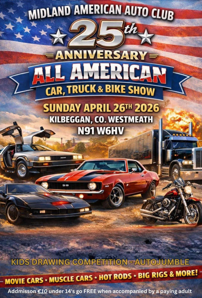 ALL AMERICAN CAR, TRUCK AND BIKE SHOWMidland American Auto Club presents the All American Car, Truck & Bike Show on Sunday 26th April in Kilbeggan, Co. Westmeath. Big Rigs, Movie Cars, Muscle Cars, Hot Rods and More. Pay on the gate – Cash only. See Midland American Auto Club on Facebook.