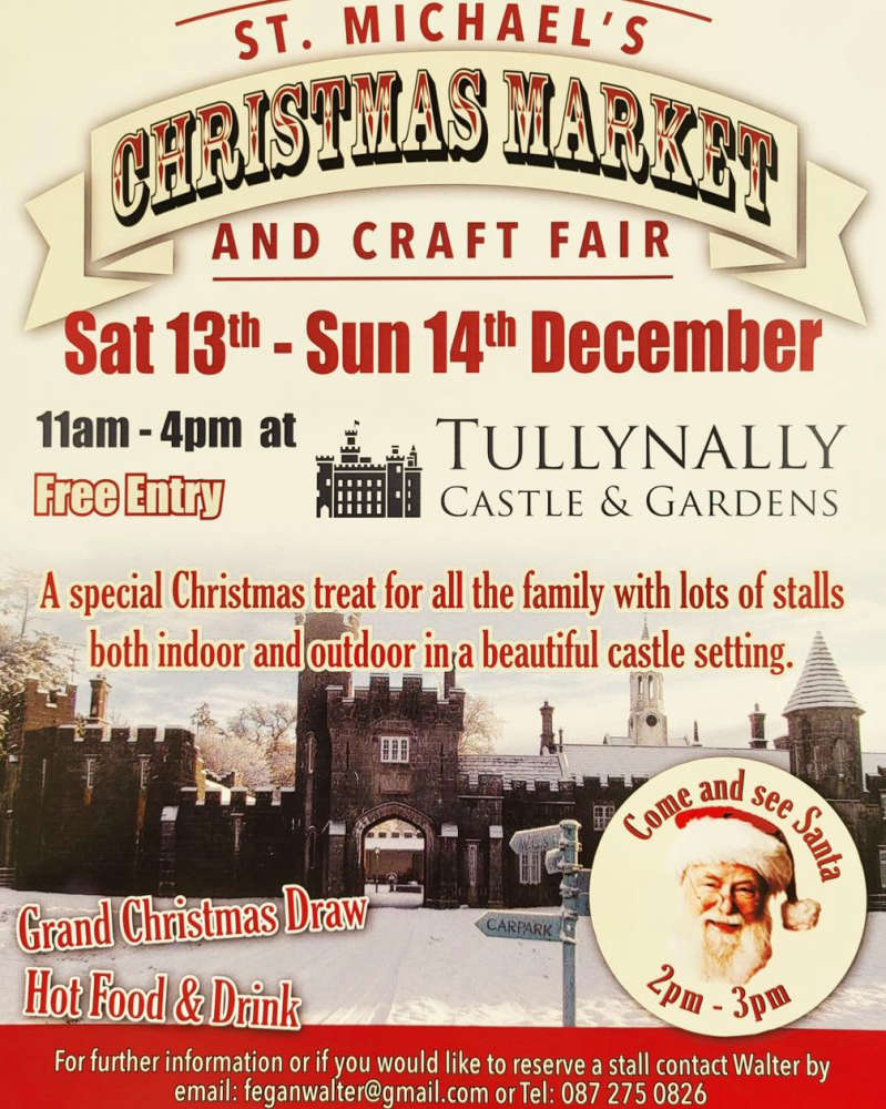 ST. MICHAEL'S CHRISTMAS MARKETSt. Michael’s Christmas Market and Craft Fair is at Tullynally Castle & Gardens, Castlepollard on 13th & 14th December from 11am – 4pm. A real Christmas treat for all the family. Craft stalls, hot food and drink, plus Santa will visit from 2 – 3pm. Free Entry.