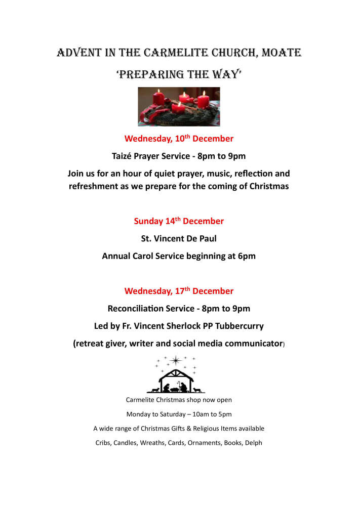 ADVENT SERVICES CARMELITE CHURCH MOATEAdvent In the Carmelite Church, Moate Co. Westmeath begins on Wednesday, 10th December with Taizé Prayer Service 8pm to 9pm. An hour of quiet prayer, music, reflection and refreshment as we prepare for the coming of Christmas. All Welcome. Also, Christmas shop now open Monday to Saturday – 10am to 5pm A wide range of Christmas Gifts & Religious Items available: Cribs, Candles, Wreaths and more.