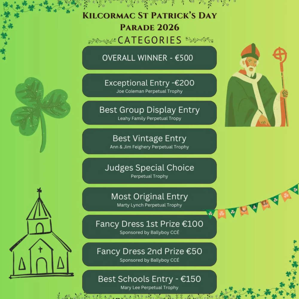 KILCORMAC ST. PATRICK'S DAY PARADEKilcormac St. Patrick’s Day Parade 2026 has it all. Sports cars, Vintage, Hayabusas to High Nellie’s. Local clubs and Societies theatrical floats, Music, Song and Dance. Fun and Entertainment for all the family. Line up at GAA field on Birr side of town Start 3:30 pm . Please note there will be diversions in place on the N52 from 3; 30 to 4; 30 approx