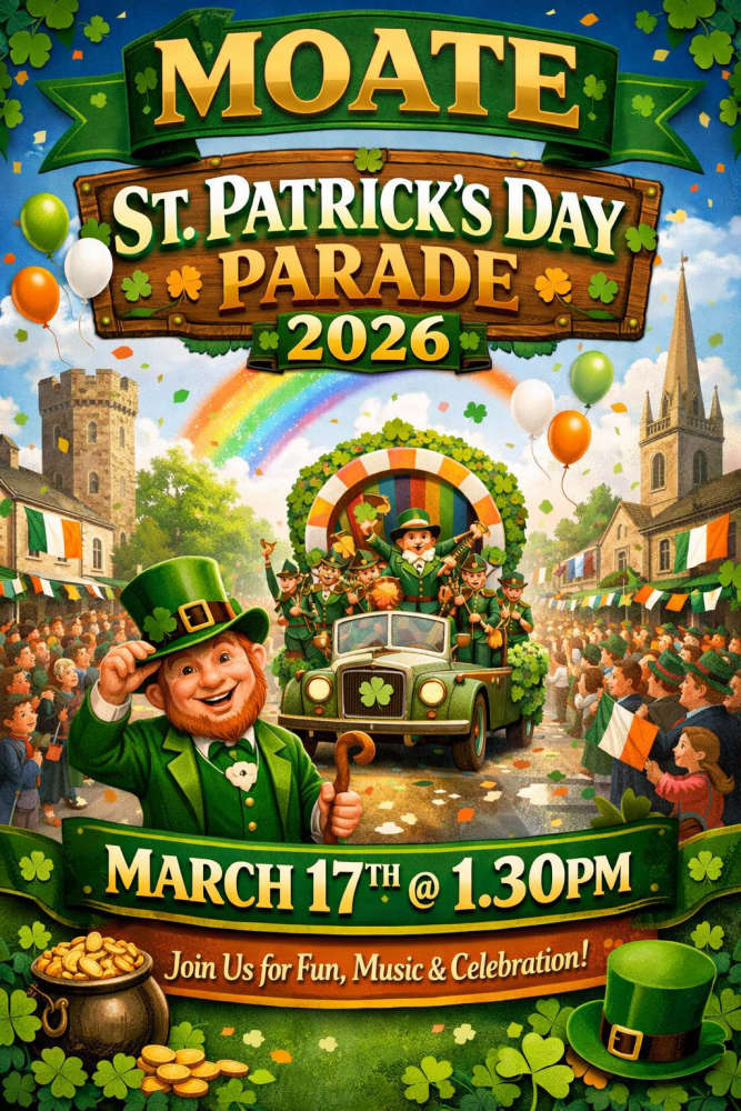 MOATE ST. PATRICK'S DAY PARADEMoate’s biggest St. Patrick’s Day Parade kicks off at 1.30pm on Tuesday. New Sensory friendly area this year, best dressed dog competition, Street entertainment, Music and food. Join us as the town comes alive to celebrate St. Patrick’s Day with Over 50 fantastic local groups, clubs & businesses. Traffic restrictions and diversions will be in place. To keep up to date see Moate St. Patrick’s Day Parade on Facebook for more. Parade starts at 1.30 p.m. from Moate Business College.