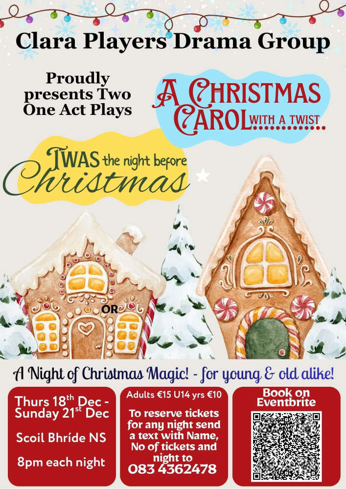 CLARA PLAYERS DRAMA GROUP - NIGHT OF CHRISTMAS MAGICClara Players Drama group are performing ‘Twas the Night before Christmas’ and ‘A Christmas Carol with a Twist ‘ from 18th to 21st December in Scoil Bhride, Clara at 8pm. Tickets from Eventbrite.