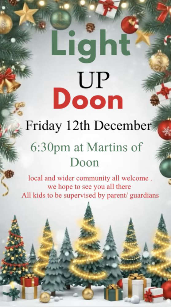 DOON CHRISTMAS LIGHTS"Light up Doon" takes place this Friday. @ 6:30pm. Everyone welcome for the official turning on of the lights at Doon Cross Roads. All kids to be supervised by an Adult.