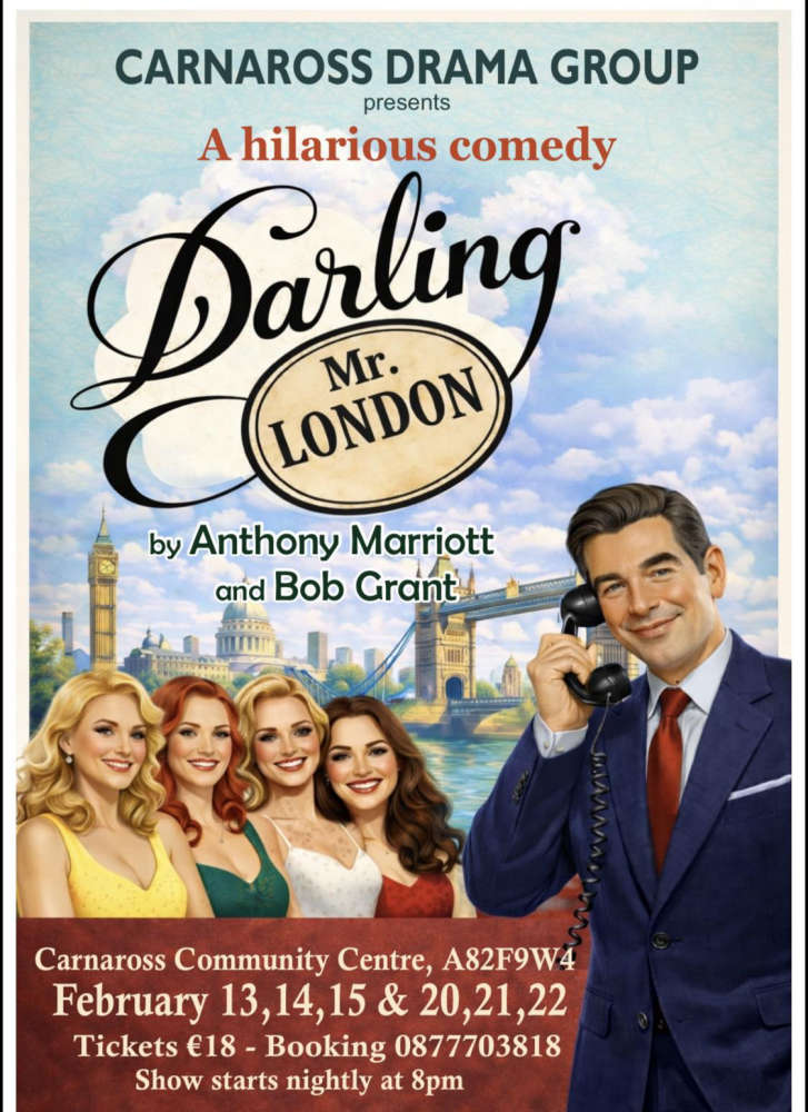 CARNAROSS DRAMA GROUPCarnaross Drama Group Presents ‘Darling Mr London’ On Valentines weekend 13th, 14th & 15th Feb. & continuing on 20th, 21st & 22nd. In Carnaross Community Centre at 8pm. Call 087 770 3818 for tickets. See Carnaross Drama Group on Facebook.