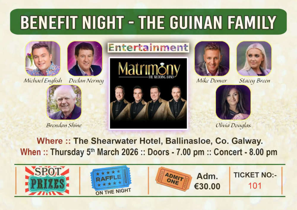 GUINAN FAMILY BENEFIT NIGHTA Benefit Night in aid of the Guinan family takes place at the Shearwater Hotel, Ballinasloe on Thursday 5th March 2026.