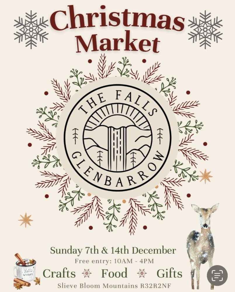 A celebration featuring artisanal food and craft traditions, accompanied by two dramatic performances (14:00 and 16:00) by Michael James Ford with music by Philip Dodd (€10 per ticket). - Christmas Market at the Falls, Glenbarrow (10:00–16:00)