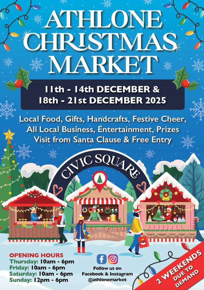 - Athlone Christmas Markets are back this year on the 11th -14th & 18th -21st December and re located in Count John McCormack Civic Square, Athlone.