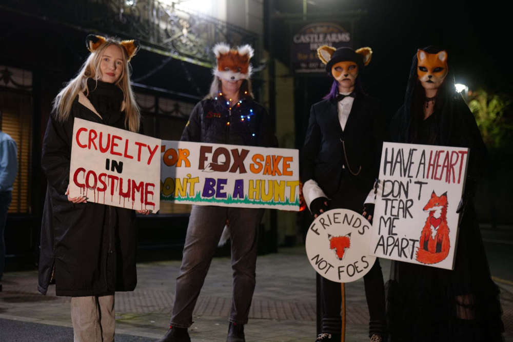 Foxes in black-tie and ball gowns danced the foxtrot outside the Castle Arms Hotel in Durrow on Saturday, 7th February, as part of a creative protest against foxhunting.