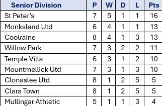 They ran out 2-1 winners away to Temple Villa, elsewhere, it was honours even between Clara Town and Monksland United at 2-2.